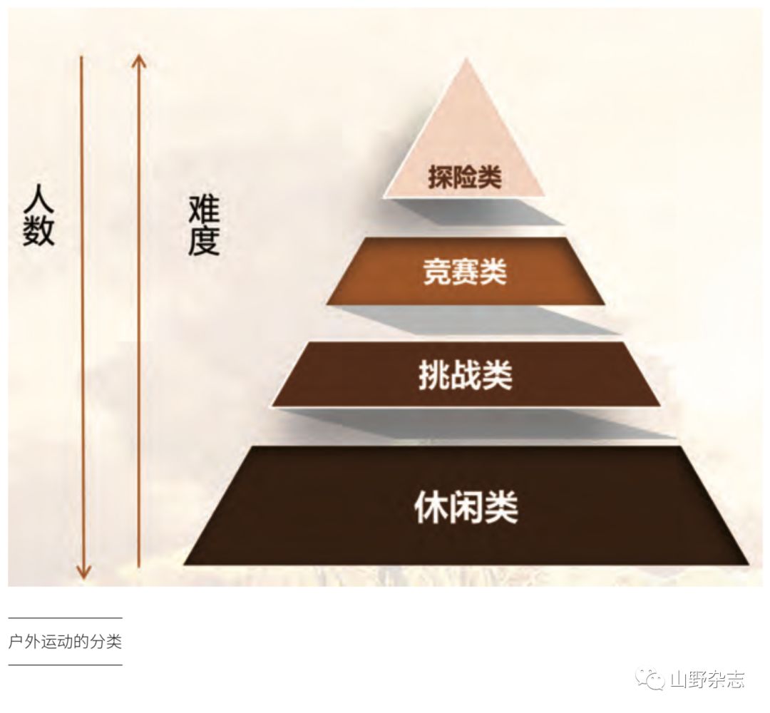 户外运动按照性质,可以分成探险类、竞赛类、挑战类和休闲类四类。从参与的广泛性和技术难度来说,这四类户外运动从上至下难度越来越低,参与的人数越来越多,组成“金字塔”型。