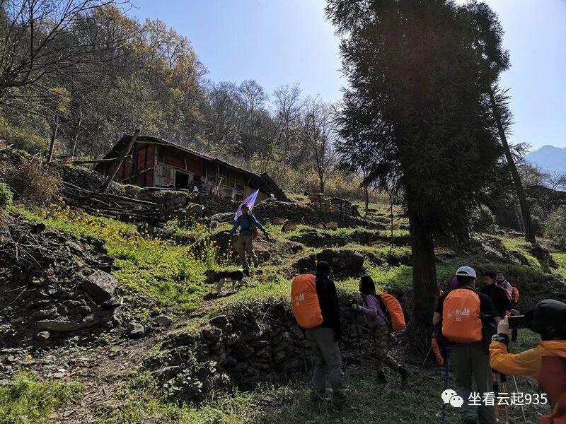 刚开始的山路并不陡峭,翠绿的树木、芬芳的花朵、潺潺的流水、婉转的鸟鸣、清新温润的空气┉加上茶主说今天穿越的距离大约15公里,一行人说说笑笑、欢快地向前进发。对树村是碧口水库风景区的边缘部分, 属于白水江自然保护区核心区,森林茂密,自然生态种群丰富,是良好的植物生态基因库。境内沟湾纵横,峰峦逶迤,森林翠茂,竹木繁多,碧潭溪流遍布,水资源丰富,气候温和,雨量充沛。密林深处栖息着大熊猫、金丝猴、羚牛等珍稀动物,绿满山峦的林海中还生长着珍稀树种香果树,大鲵等珍稀野生动物在这里繁衍生息,当地百姓自豪地说这里是“东水向西流,湾湾绿油油,九梁十八弯,湾湾水不干,蜗牛稻田遍山野,一碗泥巴两碗饭”的好地方。 向山里走了大约40分钟,茶主想去看看一位叫“老刘”的朋友,说他那儿的油菜花很美的。“老刘”是当地养蜂的农民,2016年茶主第一次带队穿越阴平古道时,在这儿伤了脚,施救过程中,其他队员暂时在老刘的窝棚歇息,期间吃了“老刘”美味的炒菜根、珍馐稀饭,猴猴现在说起来,让人听得都流口水。地方是找见了,人已经易主,留守人员说老刘在山里面另一处养蜂。油菜花已经开败,还有为数不多的晚生植株还有开花。一只小狗对这么多生人又好奇又害羞,我想拍张特定,它不好意思地跑开了。大家在这儿稍事休整继续向山里迈进。