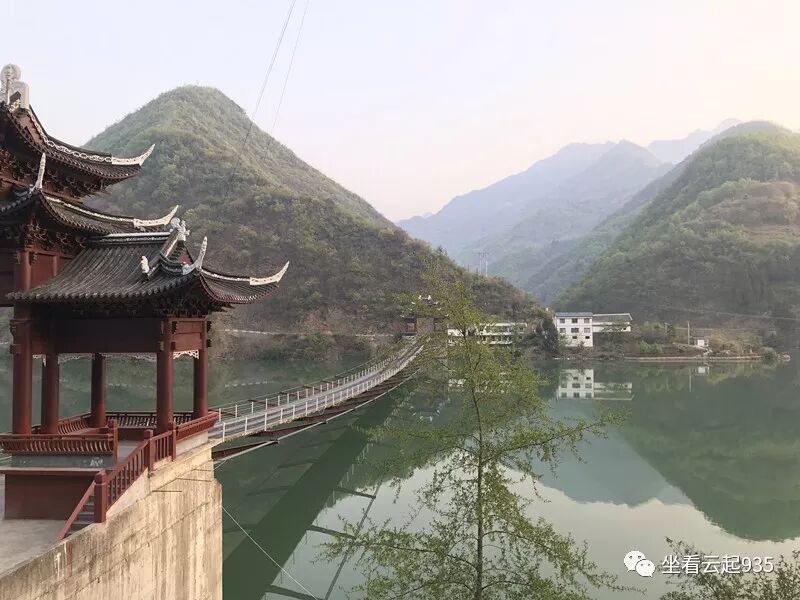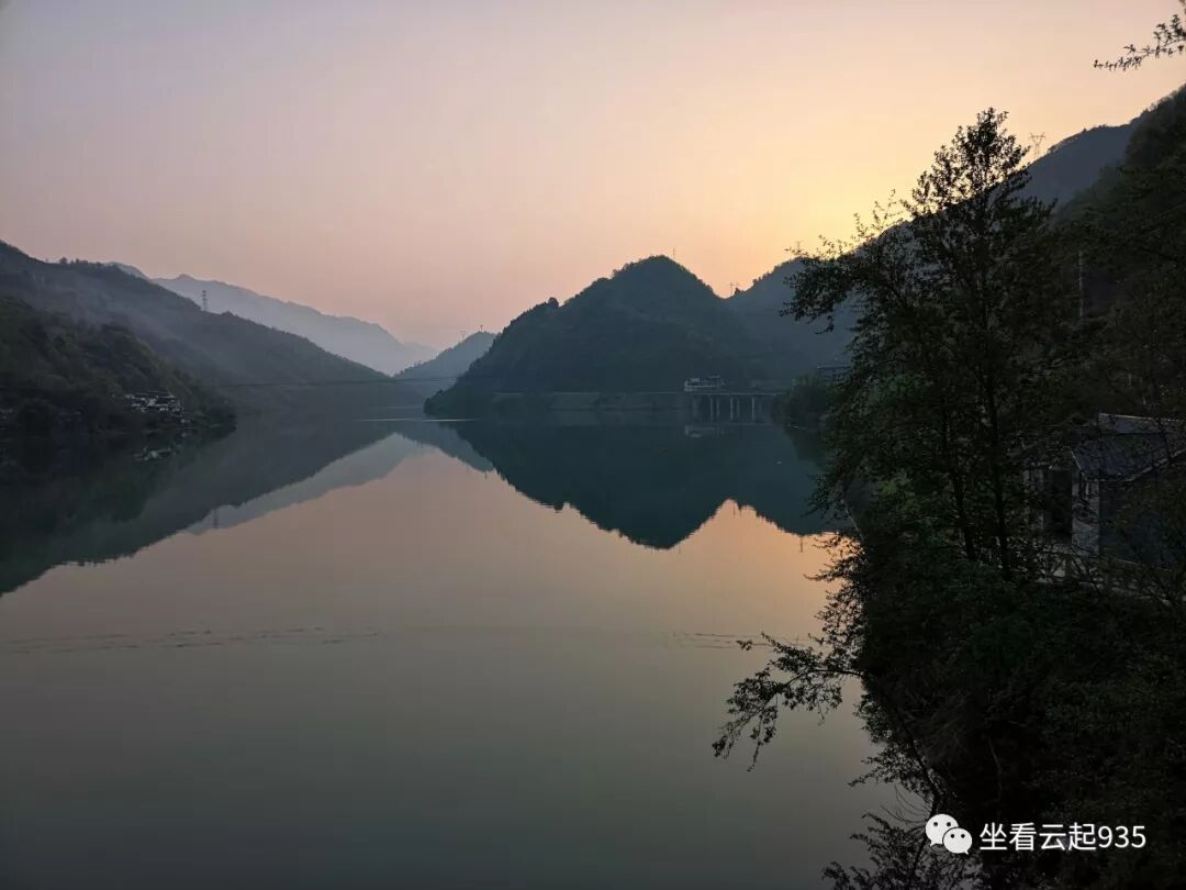 茶主约了一户店家,今天早晨6点为我们准备早餐的,清晨的小镇还在睡梦中,依稀有几家店铺的霓虹灯瑟瑟发着光辉。店家夫妇忙得不可开交,基本按时为我们提供了稀饭、咸菜之类,因了今天的行程有点远,我吃了稀饭后又要了隔壁面馆一碗面,好象是有点多了。 从青木川到我们今天穿越的出发地大约有3个小时车程,由于起得早,大家在车上都昏昏欲睡。一个多小时,车子停了下来,茶主招呼大家下车看一个“团鱼河”景区。这里是文县碧口水库上的一座吊桥,在一片群山碧水中,规模是比较宏伟的,清晨的霞光中,座座山峰倒映在安静的水面上,好一幅幽静安逸的画卷。大家睡意顿消,欢乐地在吊桥上各种照相,十几分钟后启程赶路。 碧口是文县重镇,也是我省最南端的一个重镇,以碧口电站而著名,碧口李子坝的龙井茶,更是好茶人士的珍茗。从碧口到范坝镇几十公里远,但山陡路窄,间或一些路段正在维修,还要一个多小时方可抵达。 九点多,我们到达了穿越出发地——对树村,当地居民说,这儿叫苜蓿坝。居民应该极少的,只有几户人家还在这儿种茶、养蜂。茶主召集大家交待注意事项,强调林区防火与环保要点,又给我们科普了三国邓艾出奇兵借阴平古道灭蜀的历史典故,大家摩拳擦掌,兴冲冲迈向穿越之路。