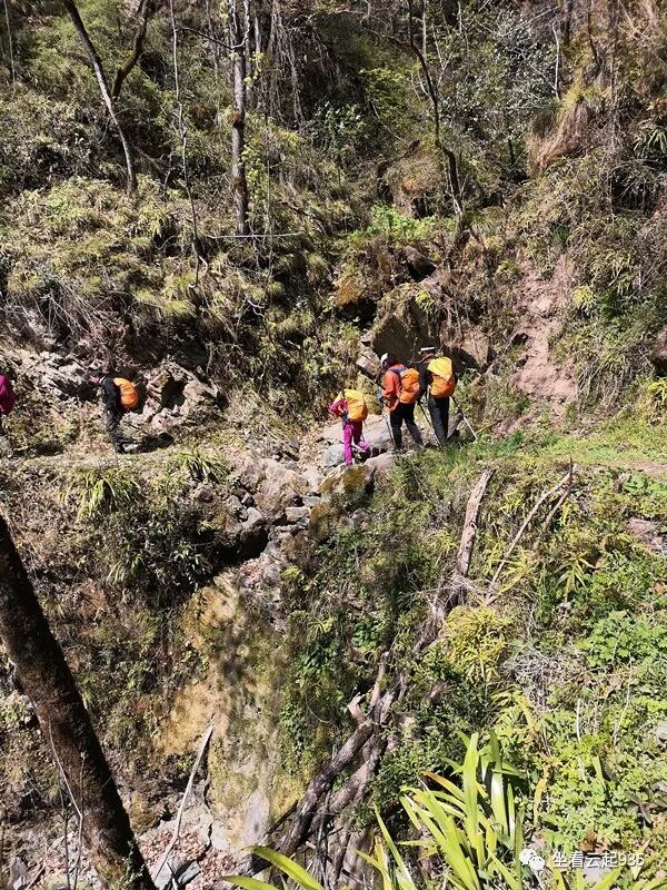 往上走的山路越来越陡峭,上面的气候也明显干燥起来,向阳的山坡上枯草漫布,干裂的土地在烈日下仿佛可以被燃了起来。经过一处河沟,已经没有一滴水迹。随着海拔的增加,大伙明显地感到行走越来越吃力,帽子他们几个在前面走得很快,茶主陪着蓝图、鸿雁等几位新徒友走在尾端,边鼓励边讲着徒步路上的趣事。 中午12时许,大伙在经过一处水瀑处休息、补给,一伙人在水上拍照料、玩水,好不热闹。茶主提醒大家注意休整时间,免得耽误后序行程。简单用餐之后,再次向前进发。