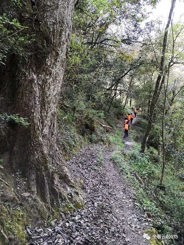 行至一处平坦地,古树遮天,许多枯死的老树,身上覆盖了厚厚的青苔,静静地躺在那里,有一株横在那里有,像是一座天然工事,我疲惫已极,只好从树身下爬过去。在这儿休息了一下,我跟高、仁,汇集了果儿、猴猴、情有独终,大家聊着天,缓解一下周身的困乏。猴猴走过这条道,说是攀上这座峰就到摩天岭了。从对讲机听得帽子、鬼鬼他们已经登山顶了,我们便打起精神,向山顶攀爬。我怕饮水不够,在旁边的山泉中接了一杯水。