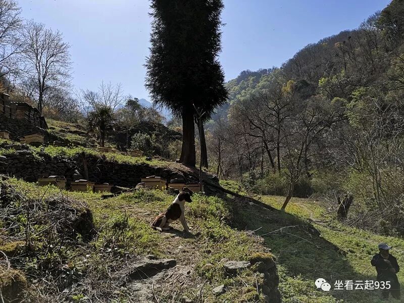 沿山势往上走了约一个时辰,有一处养蜂人和临时住处,漫山的油菜花已近尾声,但仍然十分鲜艳,几十个蜂箱杂乱地摆放着,在这葱郁的群山深处,也是那样唯美,好象是专门经过几何设计的一般,大家兴奋地拍照、前行。小屋前一块木板上晾晒了十几颗羊肚菌,我跟养蜂人一聊,说是一斤要一千多元呢。